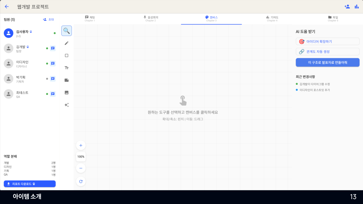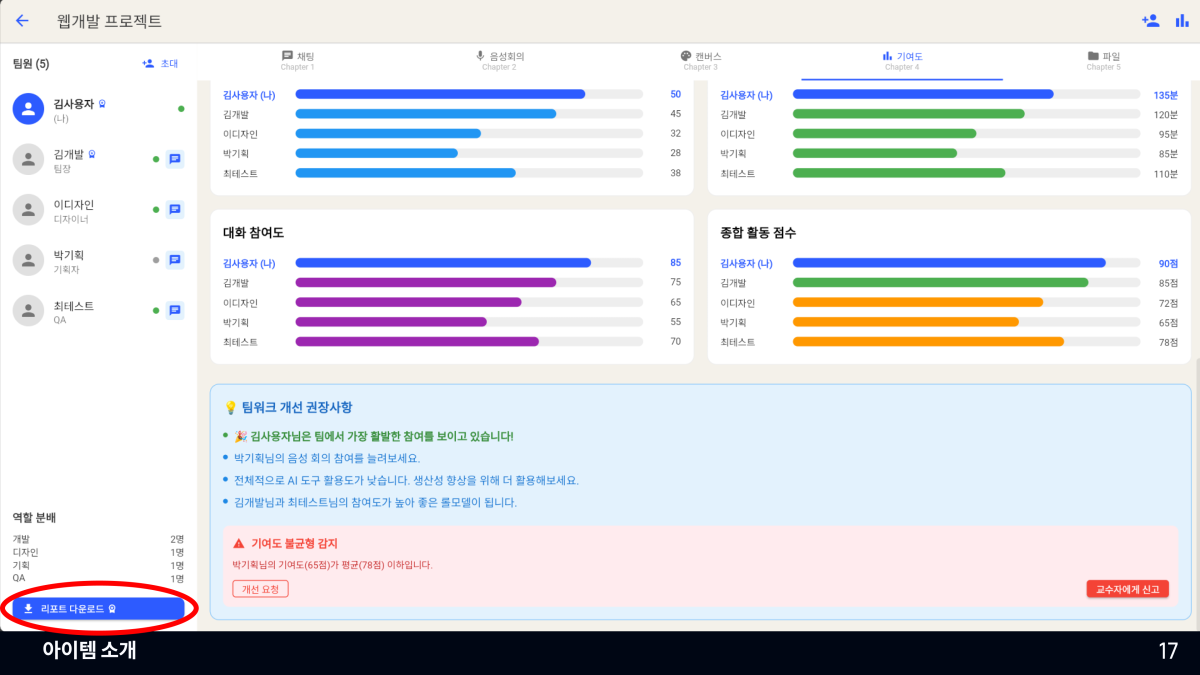 • 팀원별 기여도 분석 (채팅량, 음성 발화량, 사용 시간, 제출물 등)