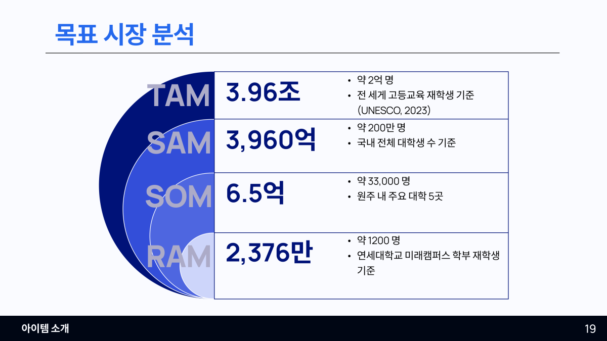 • TAM: 전 세계 고등교육 재학생 약 2억 명 (시장 규모 3.96조)