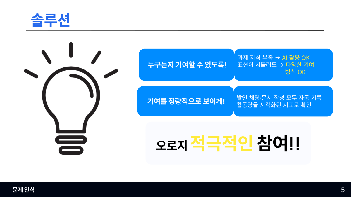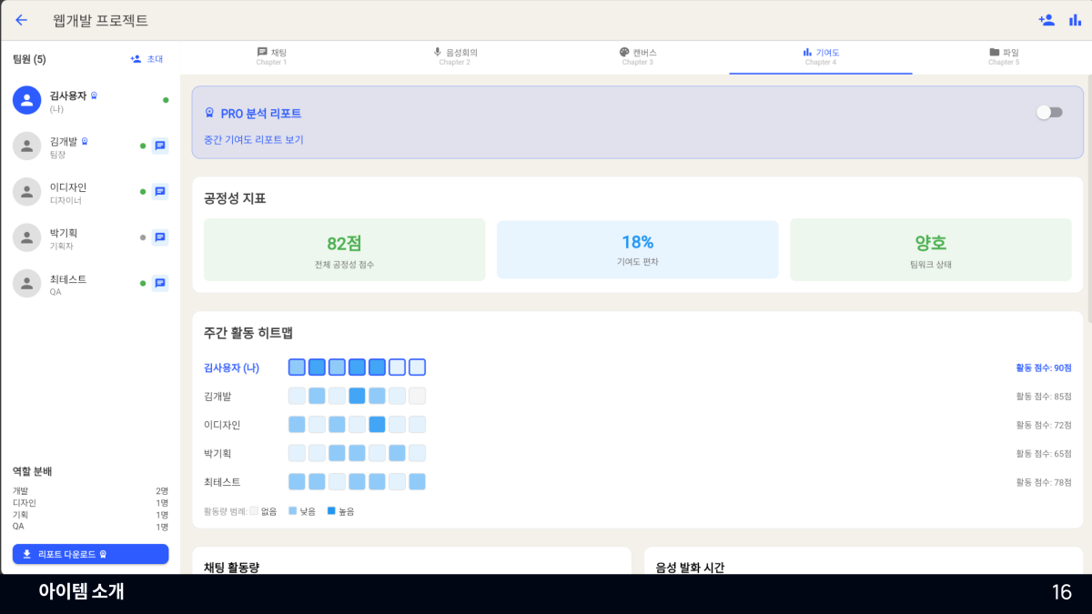 • 팀원별 기여도 분석 (채팅량, 음성 발화량, 사용 시간, 제출물 등)