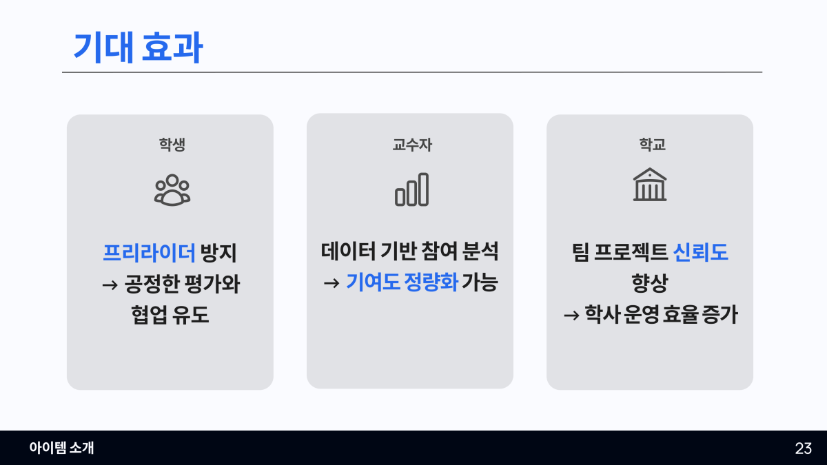 • 학생에게는 공정한 평가 제공, 교수자에게는 신뢰할 수 있는 데이터 리포트 제공