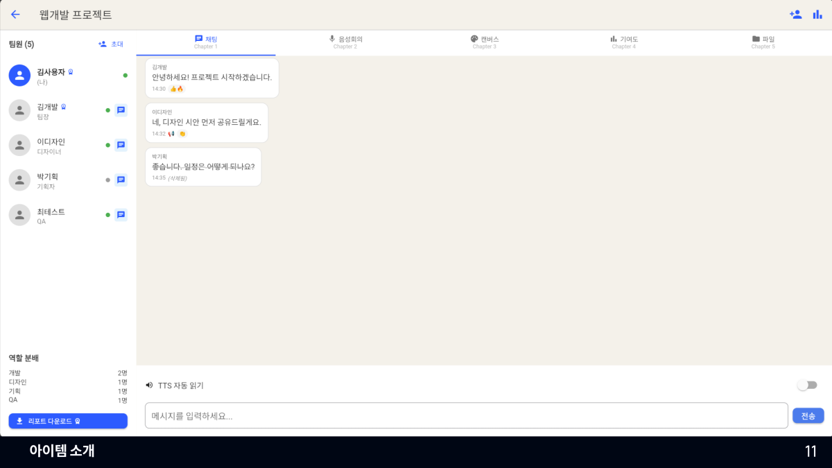 • 실시간 채팅 및 음성 회의 + TTS 읽어주기 기능